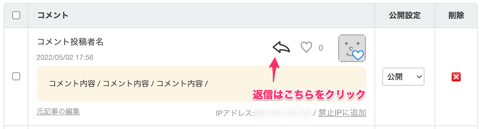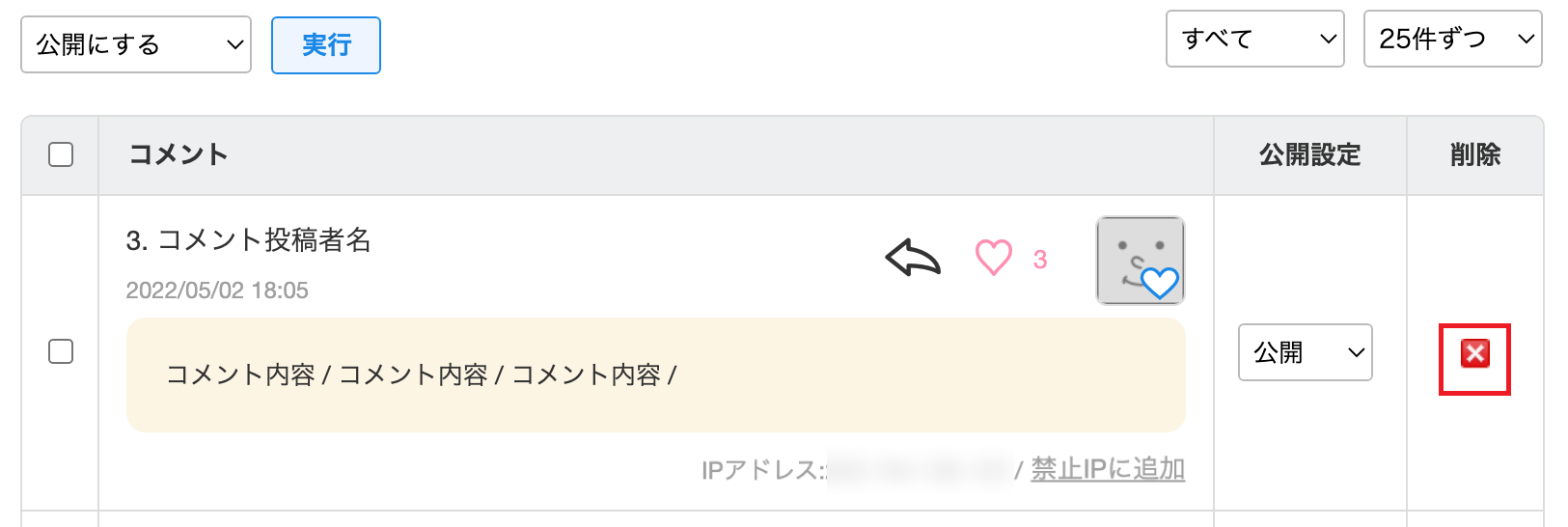 コメント一覧では、 「コメント内容」、「投稿者」とその「IPアドレス」、