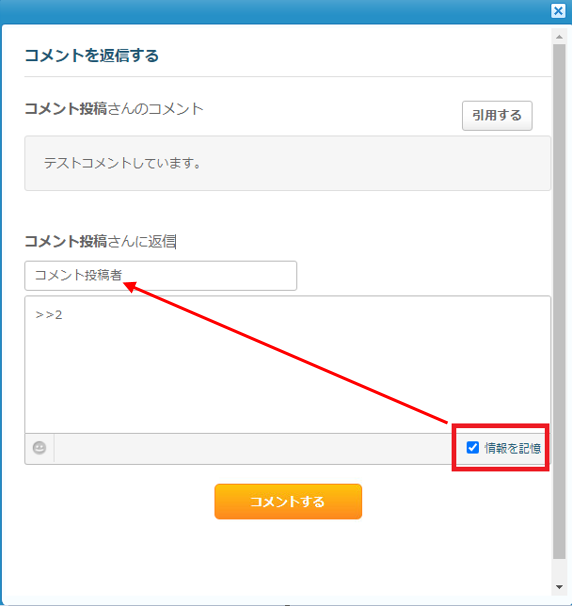 名前やコメント、絵文字を入力し、「コメントする」ボタンをクリックします。