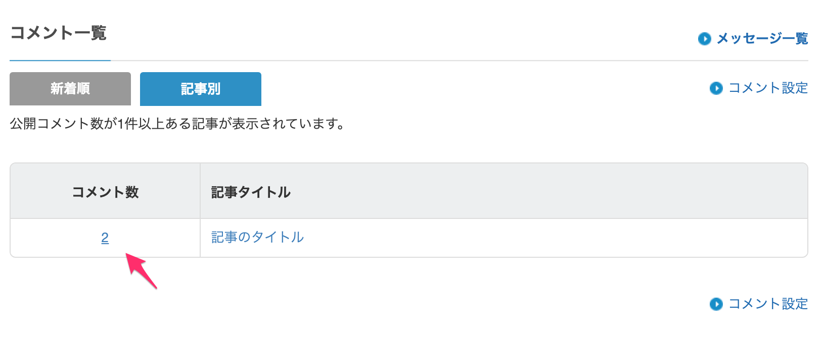 コメント数のリンクをクリックすると、記事別のコメントを確認できるページへ移動できます。