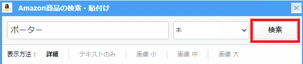検索結果が下に表示されます。目的の商品があったら、キーワード入力欄の下で「表示方法」を選択し、「挿入する」ボタンをクリックします。