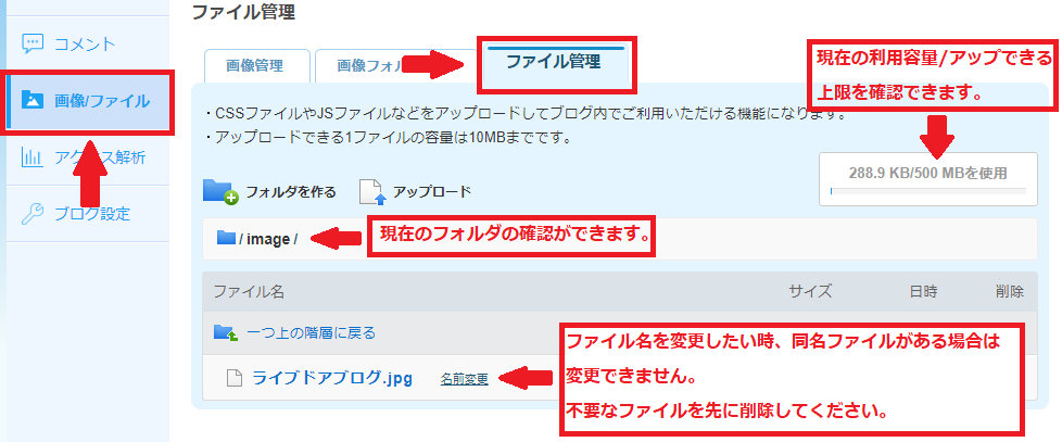 新規に開設されたブログでは一定期間「ファイル管理」の機能が利用できないよう、機能を制限しております。