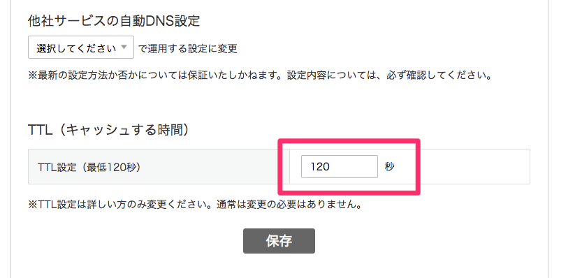TTL設定の数字は設定が維持される秒数です。120秒は2分です。独自ドメインの設定中は最短時間の120秒(2分)で設定すれば、問題あっても2分後に更新されるのですぐに変更が反映されます。問題がない状態になったと確認できたら、デフォルトの1200秒(20分)に変更してください。