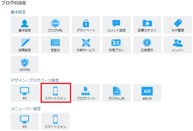 - ブログ設定>デザイン / ブログパーツ設定>スマートフォンをクリック。