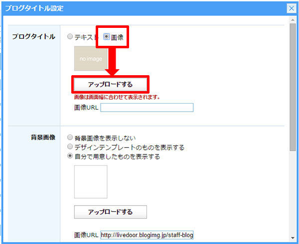 - ブログタイトルを画像にチェックをいれアップロードするボタンをクリック