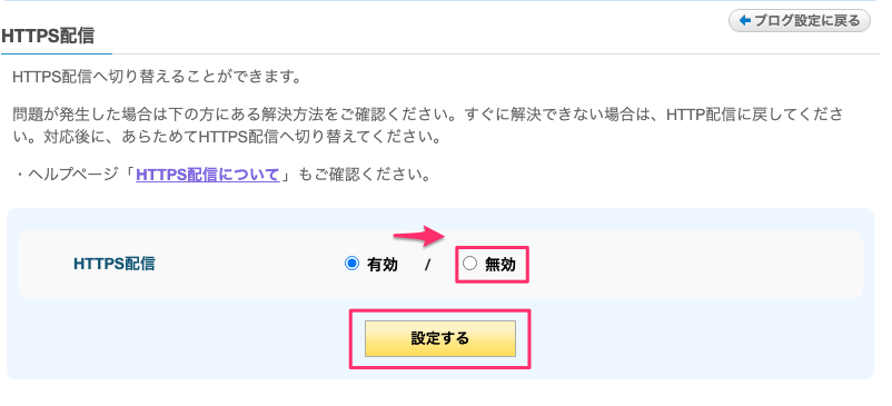 actionのURLを変更したにも関わらず、コメントできない場合は、別の問題が発生している可能性があります。問題が解消されない場合は、HTTPS配信の設定を「有効」から「無効」に変更して、コメントの投稿テストをしてください。