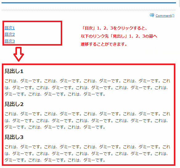 (目次箇所)※上記のようなHTML記述により、「目次1」をクリックした際、