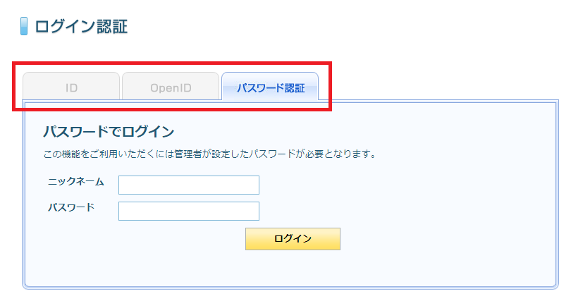 下記画像のように「ID」「Open ID」はグレーアウトし、「パスワードのみ」しか選択できません。
