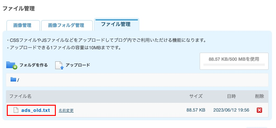 ads.txt設定機能の提供を開始したURL形式のブログについては、同様に「ファイル管理」にアップロードされたads.txtファイルは無効になる予定ですのでご注意ください。